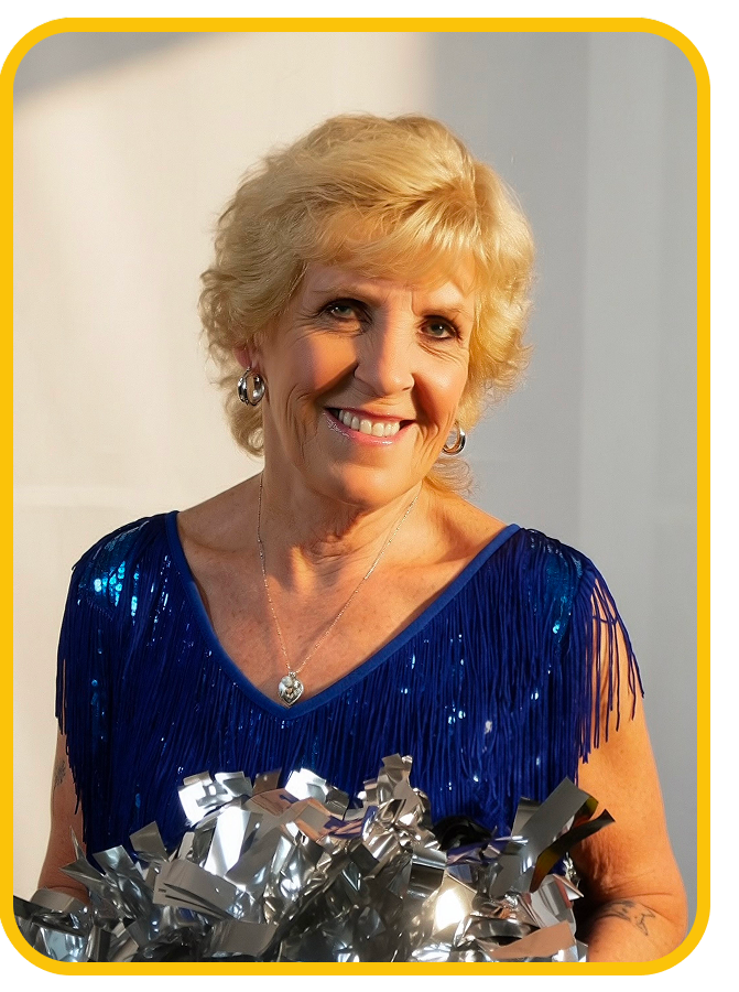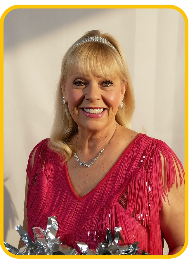 I’m a retired flight attendant originally from Cleveland, Ohio. I’m blessed with 3 terrific kids and 3 fun grandchildren. I marched in my first parade at the age of 5, a mini majorette. My mom taught all of the baton twirlers, my dad gave us the marching beat with his drums! I was a cheerleader and dancer through my school years and beyond, helped teach ballet and owned a Jazzercise franchise as well. So happy to be given an opportunity to shake those Poms again! These Gals are terrific!